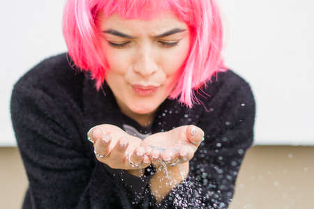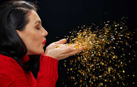 Beautiful young woman in red sweater blowing on confetti on black background.