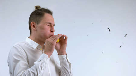 Profile of a Caucasian male inflating a pink balloon. Preparation for the holiday. White background.