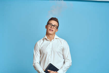 A man in a formal suit stands with glasses exhaling small pieces of confetti symbolizing celebration and joy in a creative display.