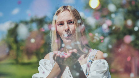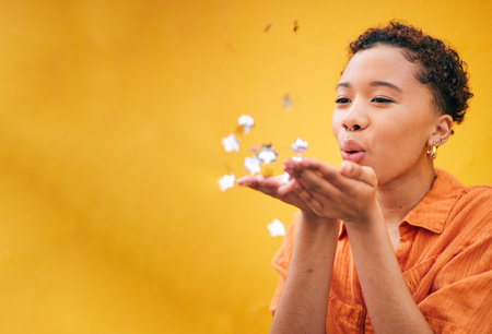 beautiful young black woman celebrating new year and chrismas party while blowing confetti decorations to camera