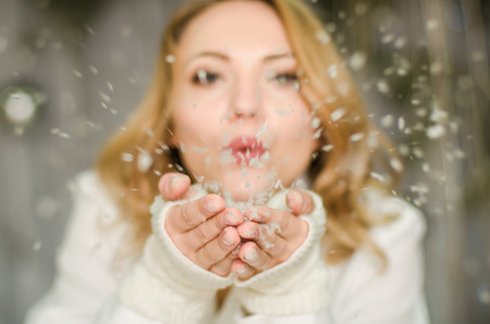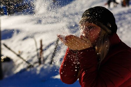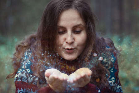 Adult woman blows at snowflakes in her hands. Winter vacation in forest.