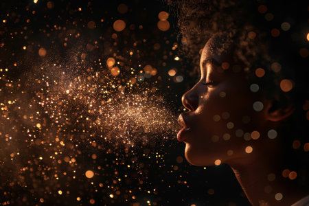 Silhouette of an afro textured man blowing glittering particles against a cosmic black backdrop