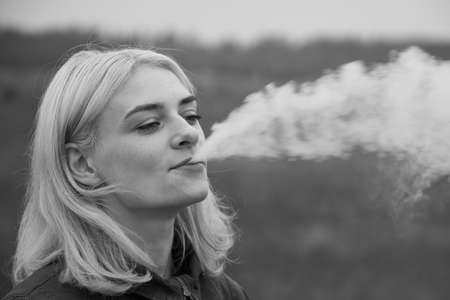 Young blonde woman exhales cigarette smoke on nature in autumn, black and white photo.
