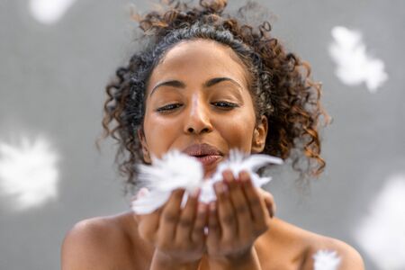 African american woman blowing white feathers on gray background. Happy beauty girl with curly hair playing with feathers after spa treatment. Joyful black lady enjoying the softness and lightness.