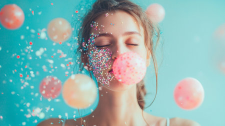 Playful image of a woman with her eyes closed, surrounded by colorful balloons and confetti in a dreamy atmosphere, creating a festive and joyful moment.