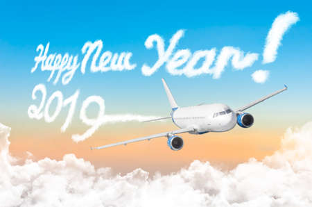 Drawing by airplane vapor steam contrail in gradient sunset sky. Happy New year concept