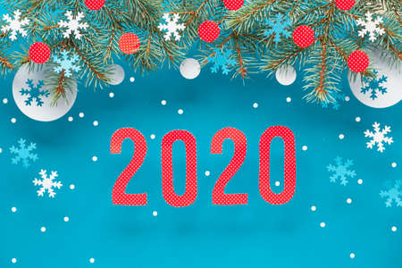 Happy New Year 2020! Festive winter background with fir twigs, blue red and white paper decorations. Flat lay, top view on light blue paper background.