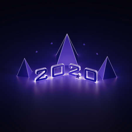 Isometric 3d render 2020 year, Christmas trees and stars in neon light. Ultraviolet glowing abstract background. Christmas illumination. 3d illustration.