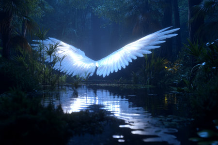 A radiant white phoenix wing illuminates a dark swamp in cinematic fantasy art style
