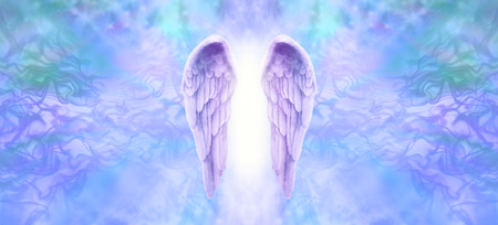 Lilac Angel Wings Banner - Wide wispy background with a pair of lilac Angel Wings on the center and a shaft of bright light between with copy space both sides