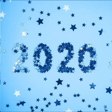 The numbers 2020 are laid out from stars on a bright blue background among different stars. Winter holidays and christmas overlay. Top view, flat lay. lolr of the year 2020.