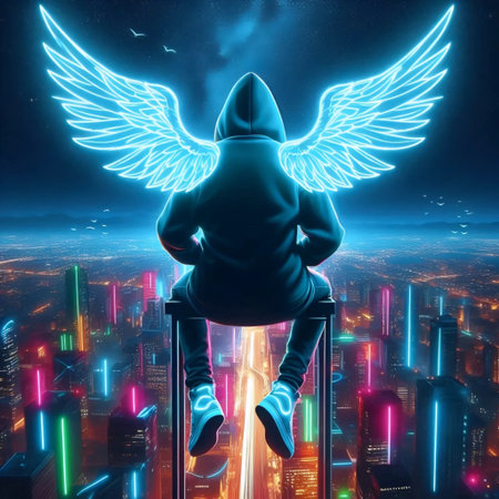 A modern angel in urban streetwear hovering above a metropolis, Ai generated image