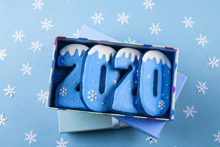 Gift present box with holiday cookies. Christmas of New Year 2020 Concept. Ginger biscuits cookies of the form of numbers 2020 on blue background. Top view. Flat Lay. Copy space