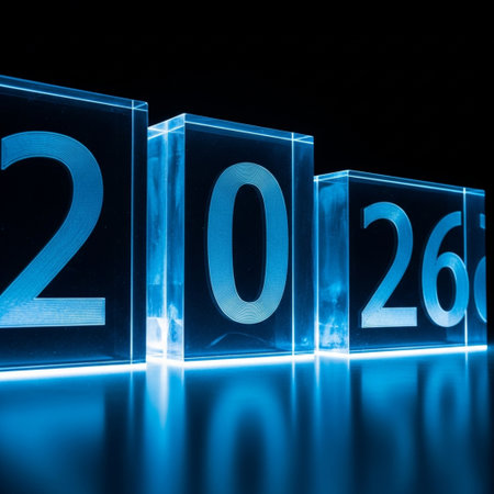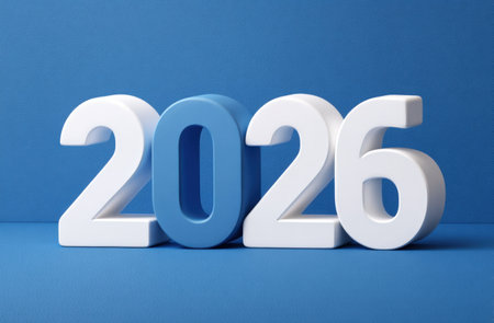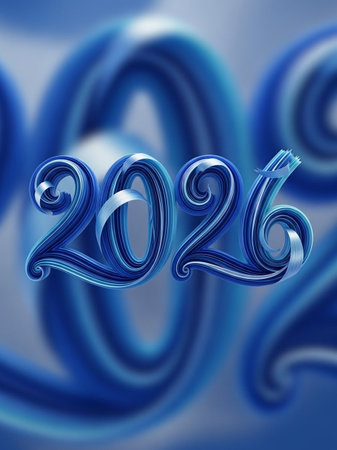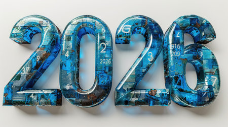Year 2026 depicted with textured blue metal numbers on a neutral background