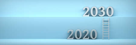 Wide banner with years 2020 and 2030 and ladder leading up on blue background. 3d illustration.