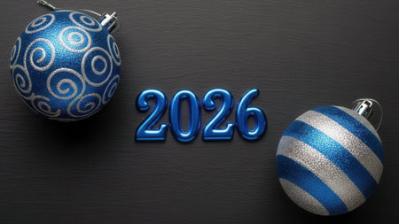The number 2026 in metallic blue is displayed between two festive Christmas ornaments on a simple black background, symbolizing the upcoming New Year celebration.