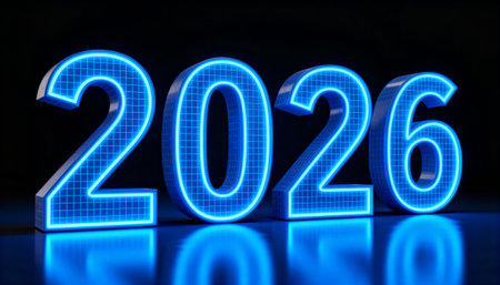 The number 2026 rendered in 3D with a glowing blue neon light effect. The futuristic digits sit on a reflective floor against a dark, empty background, symbolizing the new year.