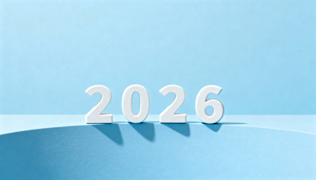 The year 2026 concept with white volumetric numbers on a minimal blue surface. A clean and modern design for a New Year celebration or future planning.