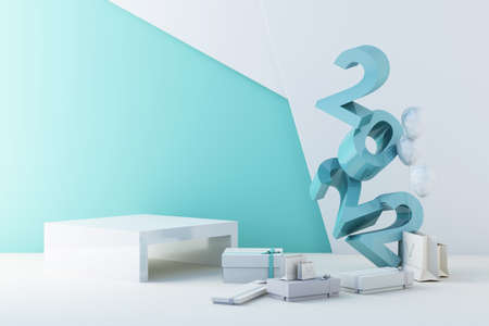 Letters of 2022 in the concept of New Year, blue tones, surrounded by geometric shapes for displaying the products and gift boxes with transparent balls. 3d rendering