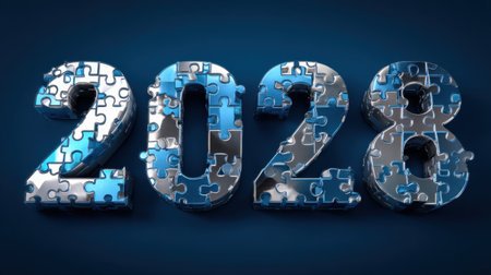 This captivating image features the year 2028 crafted from vibrant metallic puzzle pieces, symbolizing the complexity and potential of the upcoming year.