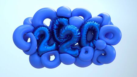 2020 new year 3d rendering illustration. Blue abstract shapes with metallic foil numbers lettering. White backdrop with space for text.