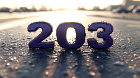 Close-up of purple numbers 2003 on a wet, dark surface. Icicles are dripping from the numbers. Water droplets and reflections are visible on the surface.