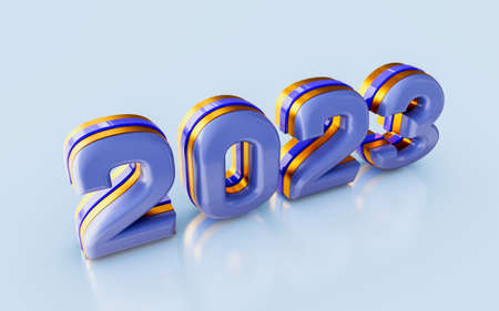 Blue metallic 3d number 2023 on a white background with a shadow at the bottom. New Year Christmas.