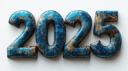 Vintage blue and gold numbers '2025' with a rustic texture on a white background, celebrating the New Year