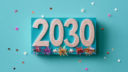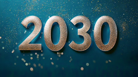 Glimmering Metallic 2030 Numerals on Textured Teal Backdrop with Celestial Sparks and Light Effects