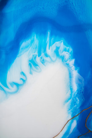 Part of original resin art, epoxy resin painting. Fluid art for modern banners, ethereal graphic design. Abstract ethereal gold, bronze, blue and white swirl. Marble texture.