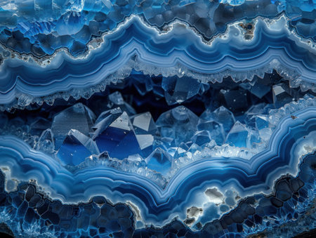 This captivating close-up image showcases a piece of blue agate, highlighting crystal formations with golden accents, perfect for nature themes.