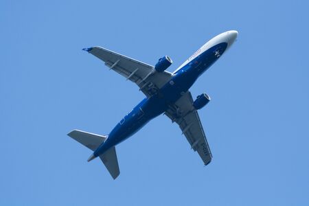 Odessa, Ukraine - CIRKA 2019: Passenger airplane in the air with landing gears lowered before boarding at the airport under different racks as an illustrative editorial