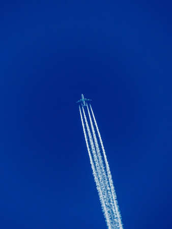 Large four engine passenger supersonic airplane flying from left to right high in blue cloudless sky leaving long white tracks