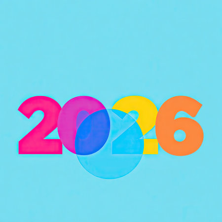 This graphic showcases the year 2026 in vibrant colors against a plain blue backdrop. The design employs a layered, semi-transparent effect. The composition is likely digitally created, with smooth textures and bold hues. It can be useful in editorial content, advertising, and other commercial applications.