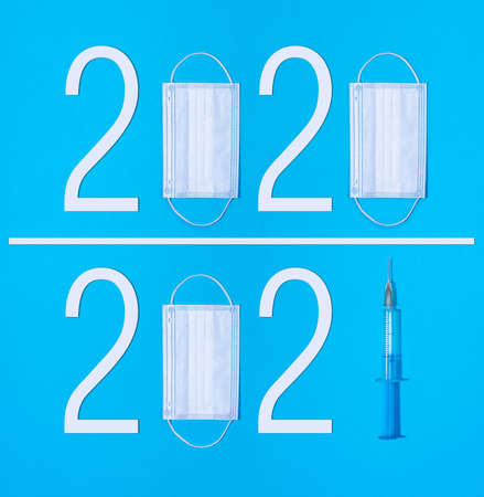 2021 year of vaccine registration and mass vaccination of the world s population, the concept of victory over coronavirus in the new year - Dates of 2020 and 2021 with masks and vaccine syringe
