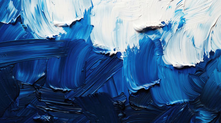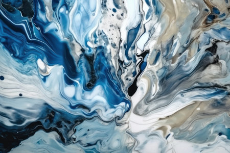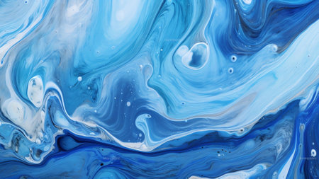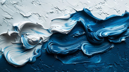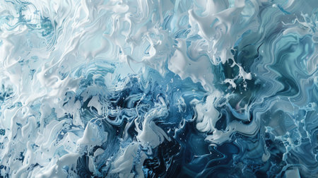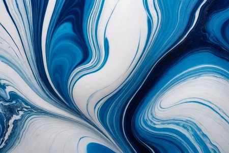 This abstract image showcases a stunning combination of swirling blue and white paint textures. The dynamic movement and smooth transitions create an artistic and modern appeal, perfect for various creative projects.