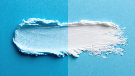 A close-up view shows a clean smear of sunscreen on a smooth blue background, highlighting the texture and color differences.