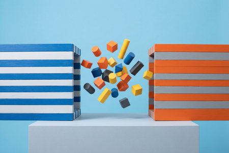 A minimalist abstract composition is presented, featuring precisely cut geometric shapes. Overlapping triangles and arrow-like forms in shades of blue, navy blue, and white create a dynamic and visually engaging arrangement. The sharp angles and clean lines suggest a sense of precision and direction. The white background provides a stark contrast, allowing the colored to stand out. This arrangement evokes themes of strategy, movement, and modern principles.