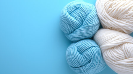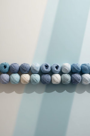 AI Generated. Blue yarn balls arranged in a row on a light blue background creating a gradient effect