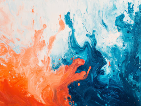 Blue paint pouring from a can onto an orange surface, forming a dynamic abstract pattern.