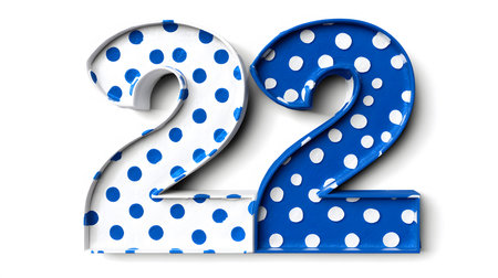 Three-Dimensional Blue and White Polka Dot Number Twenty Two on isolated white Background, The surface appears slightly uneven, suggesting a unique material.