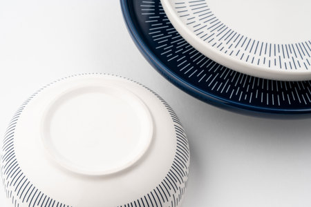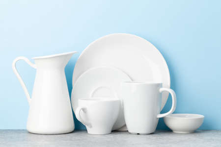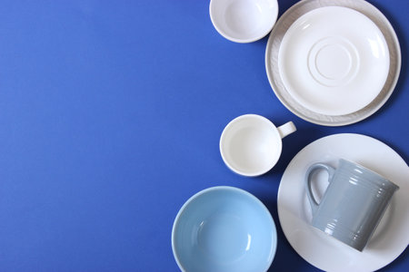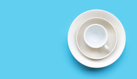 Kitchen, table decor and drinks menu concept - White tableware crockery set, empty cup on blue flatlay background