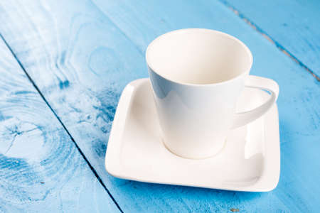 white ceramic coffee and tea mug or cup and dish set for food and drink on wood table with home interior vintage blue web banner background