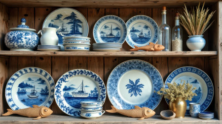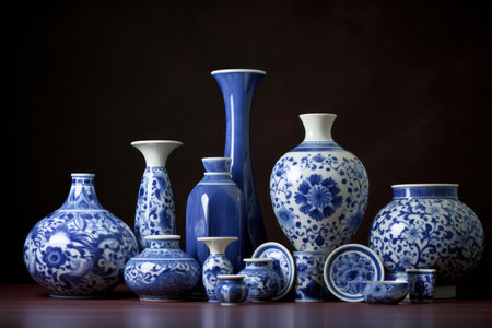 A captivating arrangement of blue and white porcelain plates and a vase on a wooden table, showcasing cultural elegance and intricate design details.