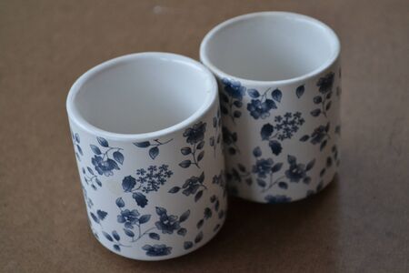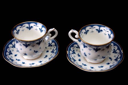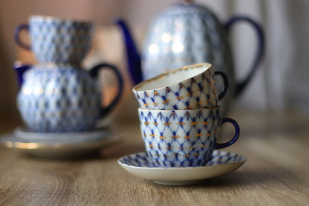 Two stacked vintage porcelain cups on the table. Selective focus.