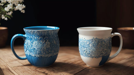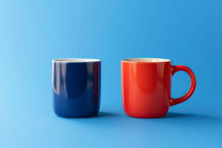 Two coffee mugs side by side on a white and blue background. Generative AI