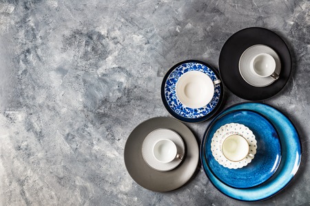 Empty Blue and Dark Plates with Coffee Cups on Grey Background, Top View, Copy Space