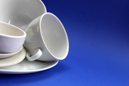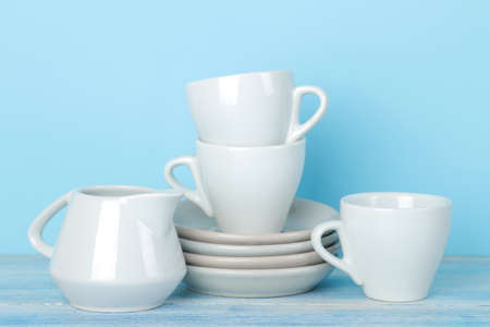 Piles of white ceramic tableware, saucers and cups on a gentle blue background. kitchenware.