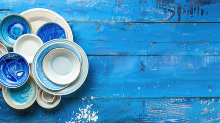 A captivating array of colorful ceramics arranged on a vibrant blue wooden surface, perfect for artistic inspiration or home decor projects.