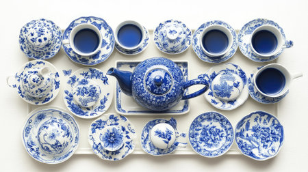 A stunning overhead view of an elegant blue and white porcelain tea set, showcasing intricate designs and craftsmanship. Perfect for decor or dining.